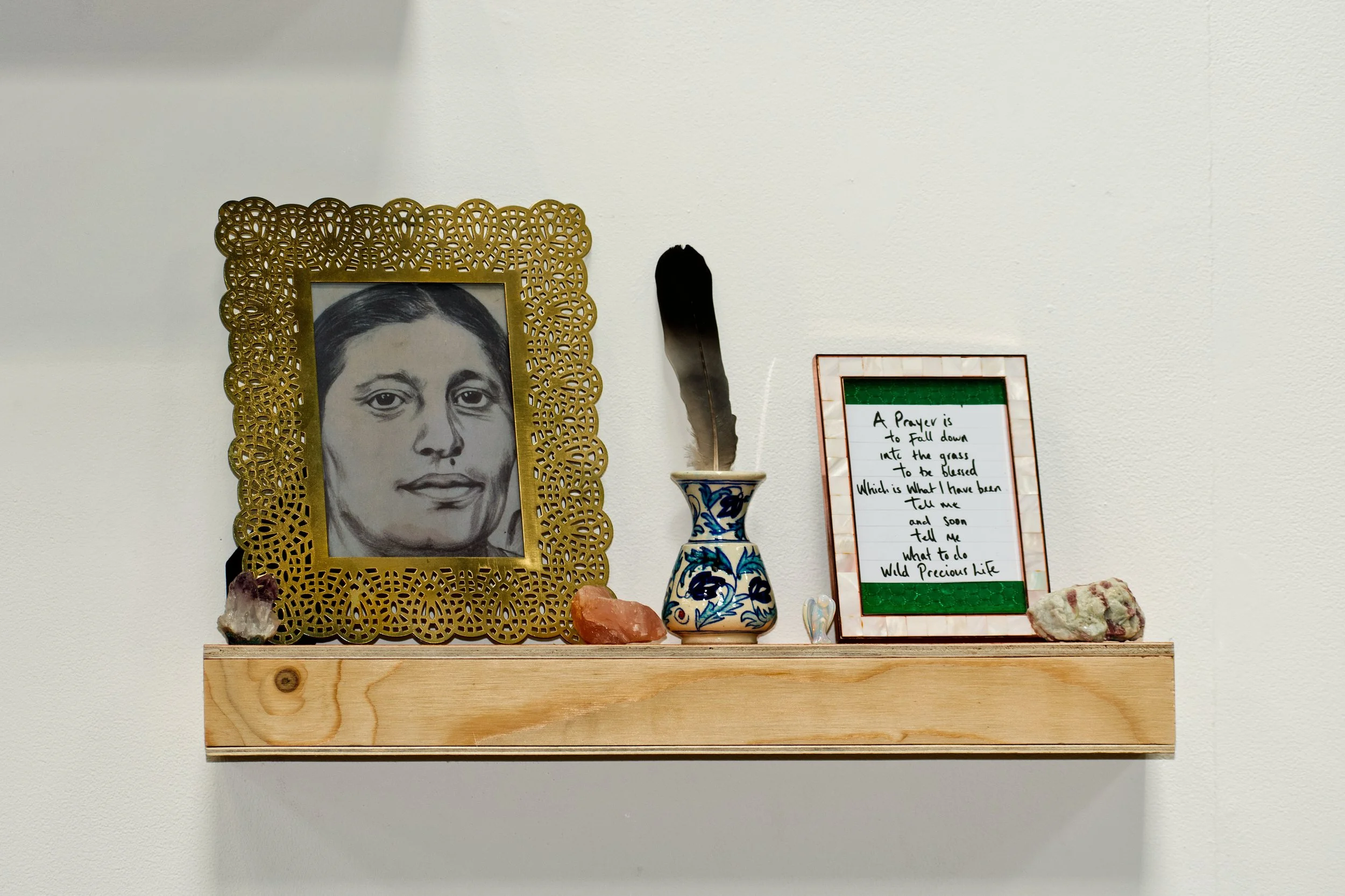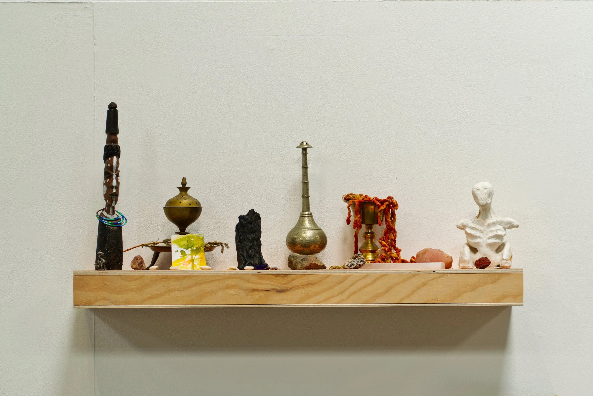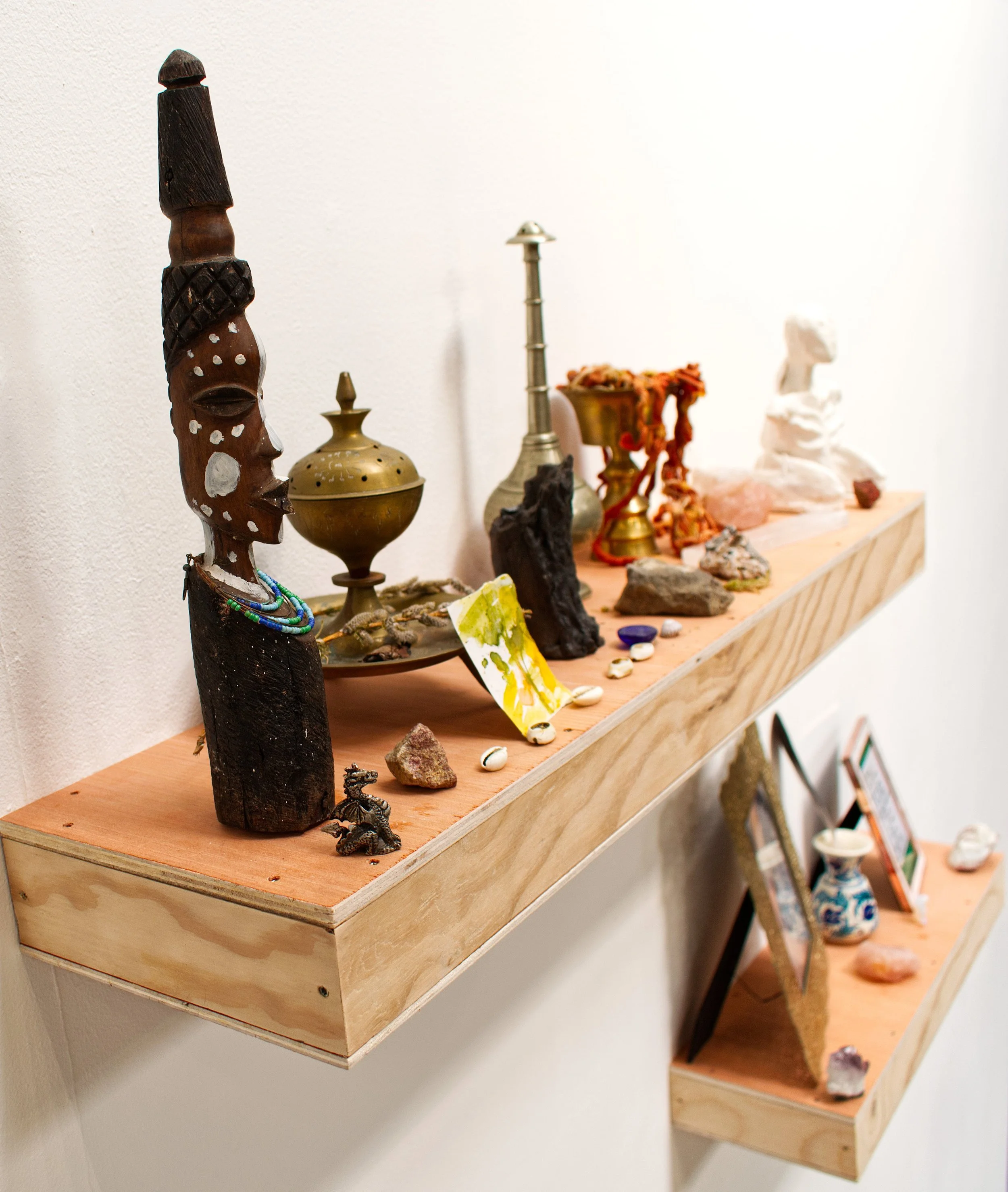 Exploring obsessions, or repetitions as ways of navigating the world. Several repetitions of one action, somewhere between custom and ritual – a simple shelf that forms an altar, a shrine with items of significance placed with intention, mementos holding memory and hope.